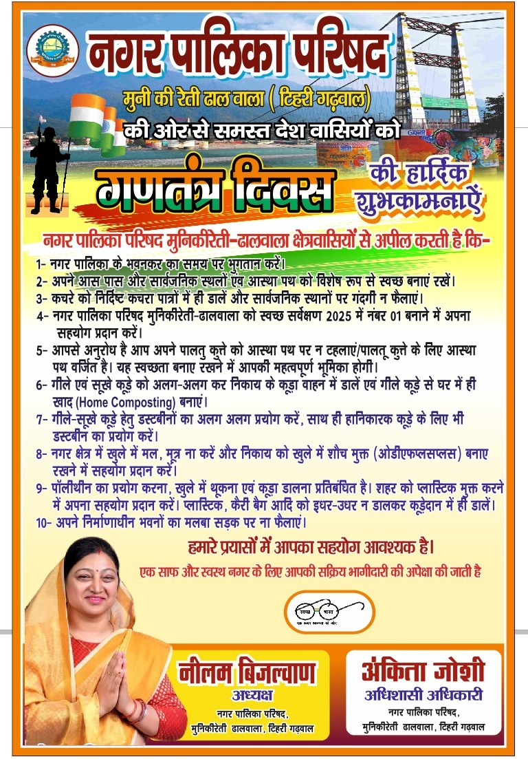 नगर पालिका परिषद मुनिकीरेती-ढालवाला समस्त क्षेत्रवासियों से अपील करती है कि- 1- नगर पालिका के भवनकर का समय पर भुगतान...