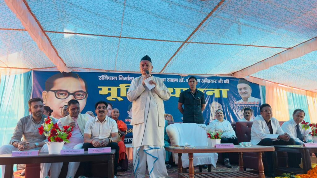 रविदास मंदिर में संविधान निर्माता बाबा साहब की प्रतिमा का अनावरण करते पूर्व मुख्यमंत्री भगत सिंह कोश्यारी
